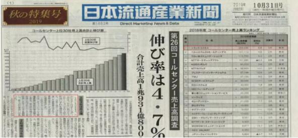 10月31日,《日本流通产业新闻》报发布“2018年度日本呼叫中心行业销售额排行榜”,transcosmos集团凭借284,696百万日元的年销售额荣登榜首。报纸评论道:transcosmos、BEL...