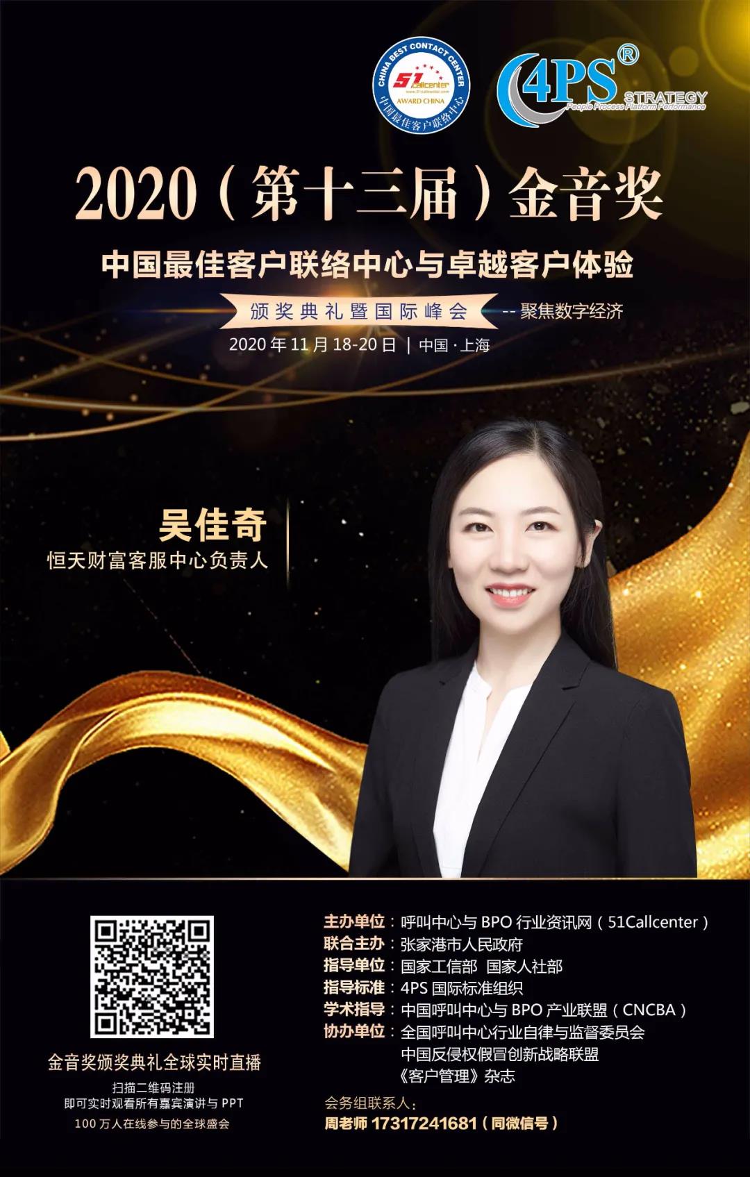 2020金音奖年会嘉宾--恒天财富客服中心负责人吴佳奇(上海,11月19-20日)