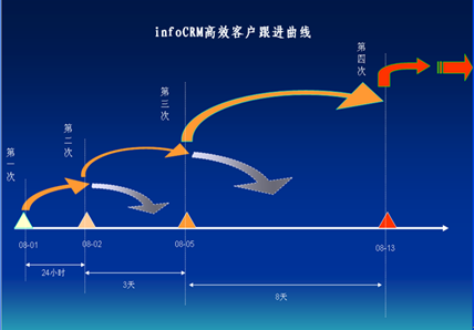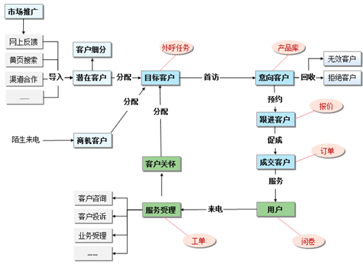 结合以上销售流程和服务流程,infoCRM典型客户服务流程是通过各种市场化手段和渠道,将采集的客户资料导入系统,为企业建立统一的客户数据库。并对客户资料进行相应归类处理以更加明确的进行数据挖掘和整理工作,以提高客户满意度和忠诚度,并不断促成交叉销售和向上销售的商机。