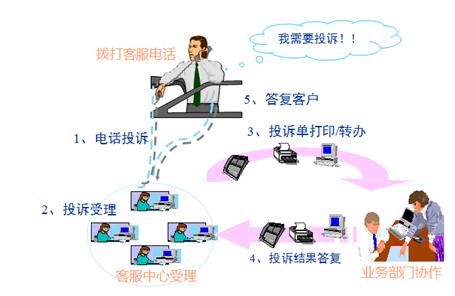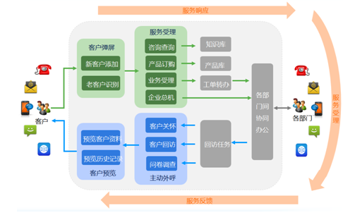客服中心既是对外服务的窗口,也是内部业务受理和流转的纽带。多渠道服务诉求统一接入客服人员工作台,咨询和查询类服务可借助知识库、产品库等相关辅助手段在线解答,受理和转办类工单则进行后台审核、流转、处理、反馈、回访的闭环服务过程。服务管过程管理人员全程监控,并对延时情况进行催办和督办处理。
