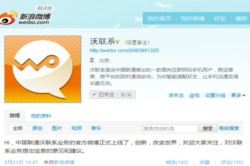 昨日下午,中国联通“沃联系”业务官方微博正式上线,而在稍后晚间,中国联通官方微博也对此微博进行推介,并称“中国联通即将推出一款面向互联网和手机用户,跨运营商、跨平台的即时通信软件‘沃联系’。为帮助用户朋友更好了解和使用这款即将上线的产品,中国联通沃联系产品组现已开通@沃联系新浪官方微博,敬请关注。”