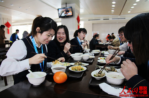 食堂的大楼很霸气,里面的饭菜也很丰盛,价格也比外面便宜不少。每人每月有200多元的伙食补贴。若是吃不完卡里的钱,还可以兑换成超市卡。