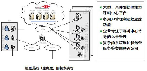 超级热线(座席版)是北京联通固定电话上开放的呼叫中心平台租用服务,客户在联通原有固话号码上开通此项服务后,即可绑定任意固话、手机作为座席电话进行接听或外呼,同时具备完善的呼叫中心电脑座席功能,座席数量按需租用即可。
