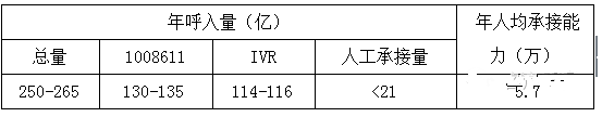 从目前全国话务情况来估算,2015年全年呼入量应在250—265亿左右。其中10086自动台承接大约是130亿左右的体量,约占49%,1008611承接量大约是114或116亿左右,约占43%,人工承接量不会超过21亿,约占8%,人均年接话量按较为保守的水平估算大约5.7万。如下表: