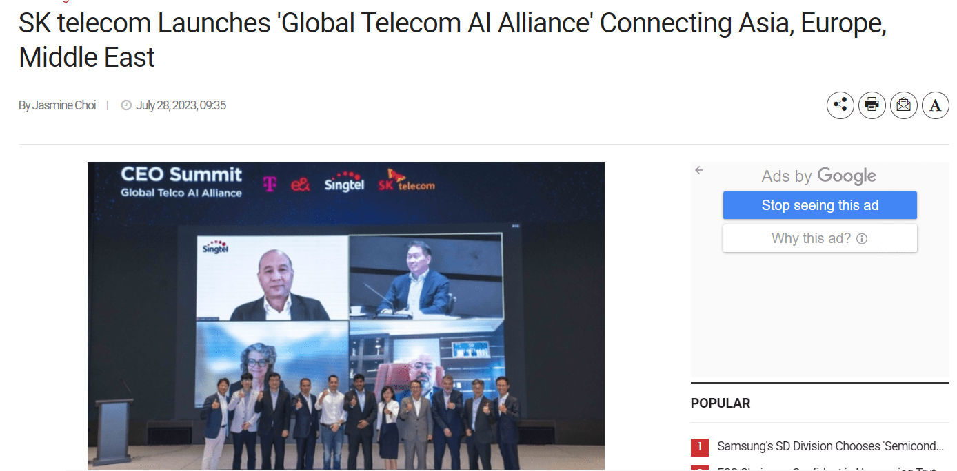会上,SK 电讯、德国电信、e&(阿联酋电信品牌)、新加坡电信牵头的全球电信 AI 联盟正式成立,并签署了 AI 业务合作商业协议,共同开发基于核心人工智能能力的电信人工智能平台。
