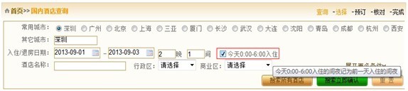 即日起,在0:00-02:30 进入房掌柜,查询酒店菜单内可勾选【今天0:00-6:00入住】选项,为您挑选出所有凌晨可入住酒店信息,即便是在深夜时分,也可进行凌晨预订凌晨入住。例如:您9月2日凌晨1点登录房掌柜,勾选“今天0:00-6:00入住”,则入住日期默认为前一天9月1日。