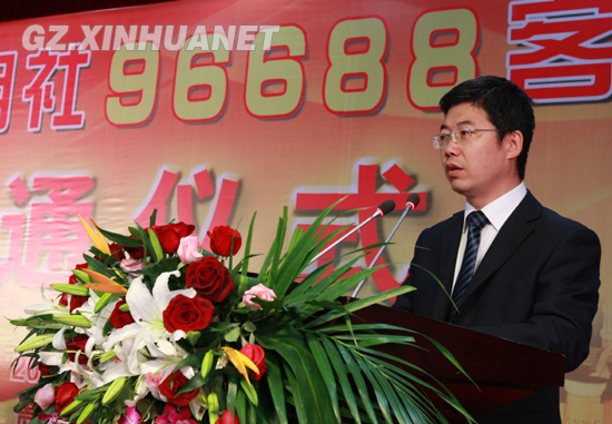 贵州省农村信用联合社理事长王术君在服务热线开通仪式上介绍热线“96688”的使用方法。 (徐洪舒 摄)