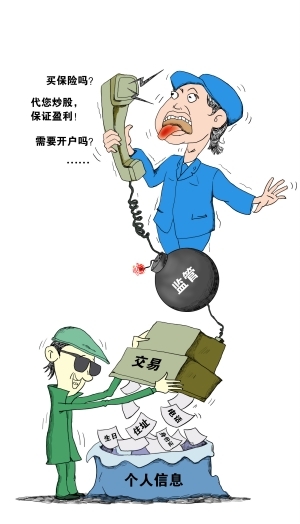 当你申请信用卡、网上购物、在金融机构办理各项业务时,一双眼睛正在窥视着你的个人信息。这不是谍战片里的画面,而是每天都会上演的现实。近年来众多买卖公民个人信息事件浮出水面,打着各种名目推销理财产品的骚扰行为也越来越严重地影响着投资者的生活。投资者在受尽各种骚扰之后无奈地发现,由于监管存在空白,各部门之间相互踢皮球,他们遭遇的是投诉无门的尴尬处境。而如果上升到司法手段,等待他们的是繁琐的程序和得不偿失的诉讼费用。万般纠结之后,大部分投资者只能吃哑巴亏,最终选择不了了之。