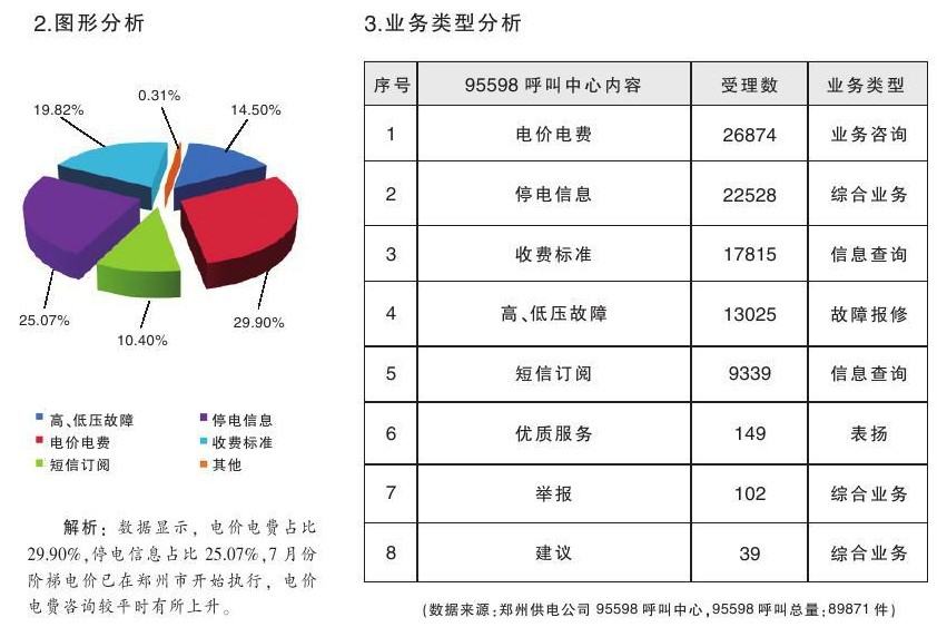1.综述:4月10日~6月10日,河南郑州供电公司95598呼叫中心共受理来电89871件,其中故障报修13025件、业务咨询26874件、信息查询27154件、综合业务22528件、举报102件、建议39件、表扬149件。