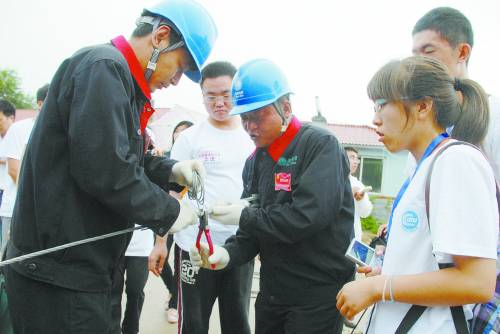 冀北承德供电承德县分公司“红语服务队”队员向大学生记者展示电力接线基础操作
