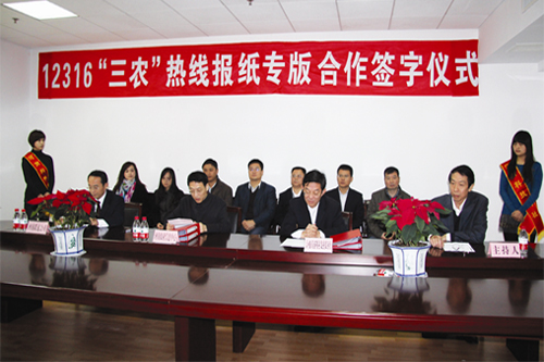 11月13日上午,12316“三农”呼叫中心热线报纸专版合作签字仪式在郑州隆重举行,河南省农业信息中心主任黄蕤和本报社社长、党委书记余东平分别代表双方在合作协议书上签字,这标志着12316“三农”热线报纸专版合作正式启动。