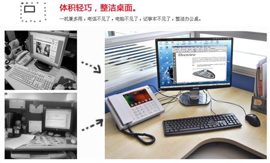 使用鳯PC电话电脑一体机,为您省去传统PC的电脑主机、日历、便笺、名片薄、记事本等办公用具用品。让您的桌面节省更多空间,办公更轻松。