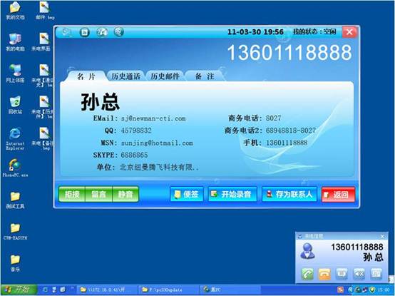 每天上班,是否已有海量式号码等着您去拨打?从对照号码,到一位一位数字的拨打。浪费着您宝贵的时间。鳯PC内置“屏幕取号”功能:自动截取屏幕上的号码,鼠标一点,即刻拨出,省去查通讯录以及一个按键一个按键拨号的麻烦。这一功能至少能保证一位销售人员每天多打50个电话。