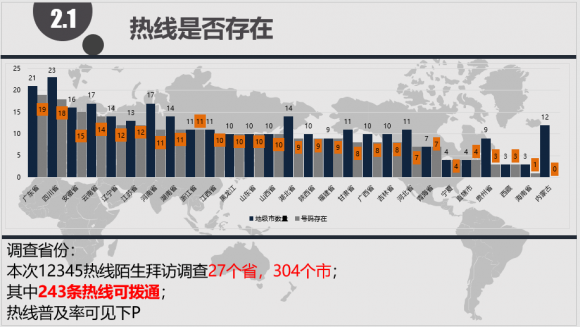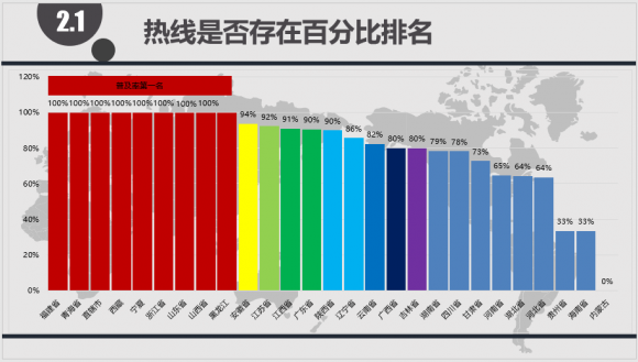 按省(直辖市)比较,直辖市、福建、青海、宁夏、浙江、山东、山西、黑龙江以100%的热线普及率位居第一,紧随其后的是安徽(94%)、江苏(91%)、广东(90%)、陕西(90%)、辽宁86%、云南82%、广西80%、吉林80%、湖南79%、四川78%、甘肃73%、河南65%、湖北64%、河北64%、贵州33%、海南33%,其中湖南、四川、甘肃、河南、湖北、河北、贵州、海南、内蒙古等省份热线普及率较低,普及率均低于70%,还有很大的提升空间。从整体调研的304个城市看,其中打不通的达到89条;