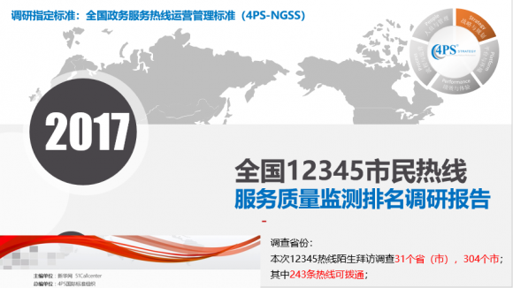 2017年11月20日-2018年5月1日, 全国政务服务热线运营管理标准编写委员会(4PS-NGSS)采用神秘陌生拜访监测方式进行调研。本次调研主要围绕热线的服务质量(含“热线接通情况”、“IVR语音播报普及度”“电话转接功能的使用度”和“服务水平满意度”等四个方面),选取了全国31个省(市)、304个市的12345热线进行了监测,并将各省的热线情况分别作出了排名和调研报告(简版),并对各省各个地级市亦做出相应2018年(上半年)全国12345市民服务热线服务水平监测排名调研报告。