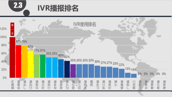 但IVR作为一个更方便的使用系统,其使用率却并不高,只有北京、上海等直辖市有100%的使用率,安徽(80%)、广东(79%)、而江苏(67%)、云南(57%)仅处于及格线边缘,河北、江西、吉林、辽宁、湖北、山东、四川、浙江、福建、河南、陕西、广西、黑龙江的IVR播报系统的使用率处于较低水平,而山西、甘肃、青海、贵州、海南并没有普及IVR播报系统,近两年还需进一步的普及和使用,增加12345热线的方便度,会使市民更加的满意。