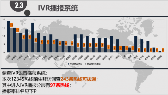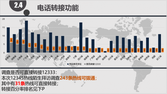 呼叫中心电话转接,主要分为:系统内部转接、转接到外线。我们对我国较多省份进行了热线陌生拜访,发现有215条热线可以接通,其中只有17条热线可以直接转接。比如,其中许多城市的12345热线不能提供市民关于劳动保障等相关问题,又无法直接转接到相应的12333热线。