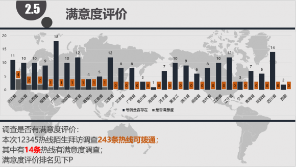 广东(18条)为最多的热线数量的省市,却只有一条热线被邀请进行满意度调查。