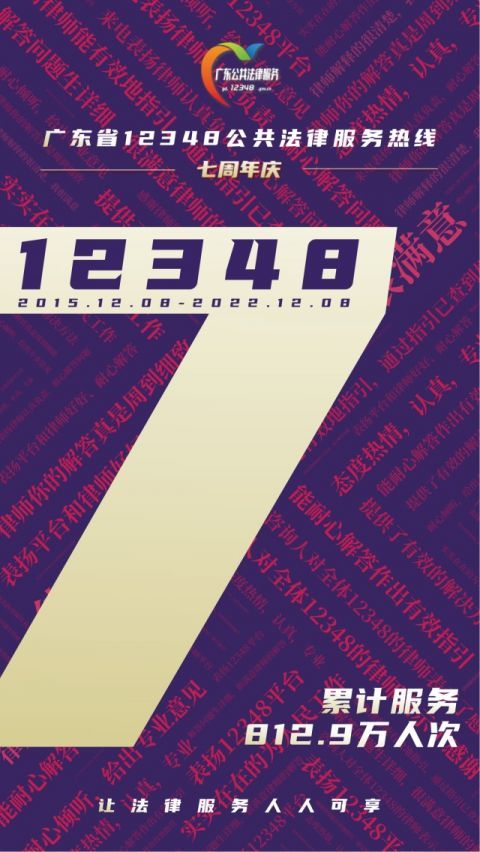 2015年12月8日,全国首个省级统筹提供全省覆盖电话法律咨询服务的广东省12348公共法律服务热线(以下简称“广东12348热线”)开通,至今已累计为群众提供812.9万次服务,年均增长24.5%,群众满意度持续保持在99.4%以上。