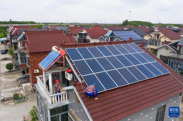 6月7日,嘉兴市光伏行业协会的维修人员在96345服务热线的协调下,来到嘉兴市南湖区余新镇长秦新村,为居民进行屋顶光伏设备检修(无人机照片)。