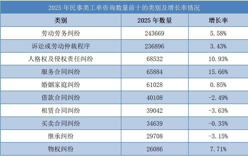全年服务总量逾152万人次,电话服务总时长超过14万小时,群众满意度99.71%!1月23日,北京市司法局公布了北京市12348公共法律服务热线平台(简称12348热线)2025年“成绩单”。在工单最多的民事类咨询中,23.28%为劳动劳务纠纷咨询,占比最重,人格权及侵权责任纠纷和服务合同纠纷咨询的增长均超过10%。
