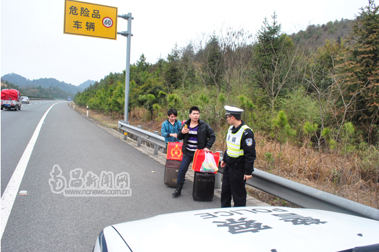 4日下午16时20分,省交警总队直属二支队第四大队巡逻民警在辖区路面巡逻时,在杭瑞高速293KM处发现两名青年男子提着行李在高速公路上行走,同时还不停向路上飞驰的车辆观望以及招手。民警见状,立即将车停在路边询问情况。经了解,两名青年一个姓王,一个姓董,都是江西省婺源县赋春镇人。2009年两人结伴一起到江苏苏州打工,至今已经有三年没回家过年了。今年两人决定回家跟家里人一起过年,但由于火车票难买,他们就经人介绍花了400元钱搭上了一辆从苏州发车到景德镇的大客车。上车前客车司机说可以帮他们送到赋春镇,结果在行驶到离赋春收费站还有20公里的婺源服务区时,司机骗他们说从这里下到赋春镇会很近,步行10分钟就到了。二人单纯地相信了无良黑心司机的话,结果下了车后才发现上了当。几经求助无果后,二人无奈决定走高速步行回家。在遇到民警之前二人已经徒步行走了3公里路程。得知其遭遇后,民警立即将其随身携带的行李搬上巡逻车,把二人安全地送到了赋春收费站。下车后,二人感激地握着民警的手说:“家乡的交警就是好!”
