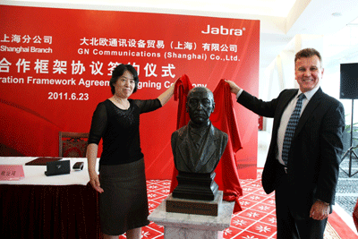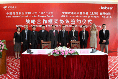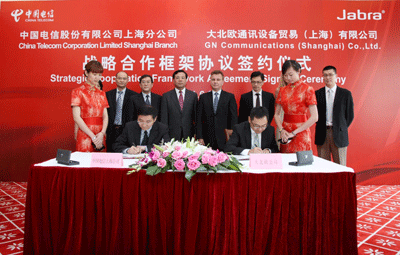 2011年6月23日,上海—全球领先的创新耳麦解决方案提供商大北欧公司(GN Netcom)与中国电信上海公司(以下简称上海电信)隆重举办了 “战略合作框架协议签约仪式”。上海电信资深经理花锐强、大北欧公司亚太区总裁Mark Leigh,及双方公司高层领导共同出席了此次庆典。Mark Leigh先生还代表了大北欧公司将Edouard Suenson先生——“将电报引入中国的丹麦人”的雕像捐赠给上海电信博物馆,见证了中国与丹麦源于19世纪末在通信方面的成功合作。