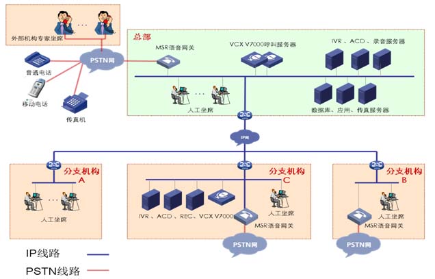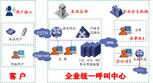 该结构是将呼叫中心的全部设备(设备由网音提供)都部署在用户现场,用户可以以企业总部为核心部署远点坐席及远端接入。