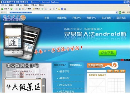 进入首页,映入眼帘的是蓝色清新的网站界面,用户选择“点击下载”健,即可快速体验捷通华声最新产品录易输入法Android版。捷通华声录易输入法包括全屏手写、窗格手写和虚拟全键盘三种输入方式,不仅识别速度快,识别率高,还可以连续书写,竖屏叠写,横屏循环写,它更贴合人们自然的输入方式,喜爱触屏上网、聊天、微博的用户不可错过!