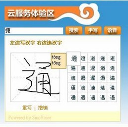 此外,值得重点推荐的是,网站还设置了云服务体验区供用户在线书写,鼠标为笔,在书写框写入汉字,如输入“通”字,右边不仅可以准确识别,更可列出汉字的拼音,多音字还可以显示多个拼音,有效解决了用户会写不会读的问题,是用户学习汉字的好工具。输完字,点击搜索,即可进入google搜索引擎查询用户需要的信息,输入搜索查询一体化的服务大大方便了广大用户。