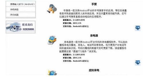 在下载中心,除了录易输入法的下载外,用户还可以下载捷通华声的其他产品,直接启动相应程序的“手搜”;融入捷通华声语音合成技术(TTS)的“来电通”;可以模拟来电应用的“虚拟来电”;应用捷通华声国际顶级语音合成技术(TTS)的“听书”和“语音词典”,以及运用捷通华声语音合成技术,汇集童声、女声、男声、机器声等数百种音效变幻的“天行乐园语音斗地主”。这些应用不仅丰富了用户的手机,更打开了高新科技的大门,让用户随时随地享受各种移动互联网服务。
