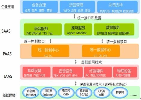 构建云呼叫中心需要采用SIP、SOA等标准的通讯技术和软件技术,既要做到语音、MAIL、SMS、IM、WEB的互联互通、统一管理,又要做到各种应用的无缝集成。对于呼叫中心应用首先是各基础模块,如CTI、IVR、REC、外呼、监控、呼叫报表等,要有统一控制、统一数据、统一接口,其次要对各类企业应用如客服、营销、排班、绩效、决策分析等有标准的统一的应用接口。
