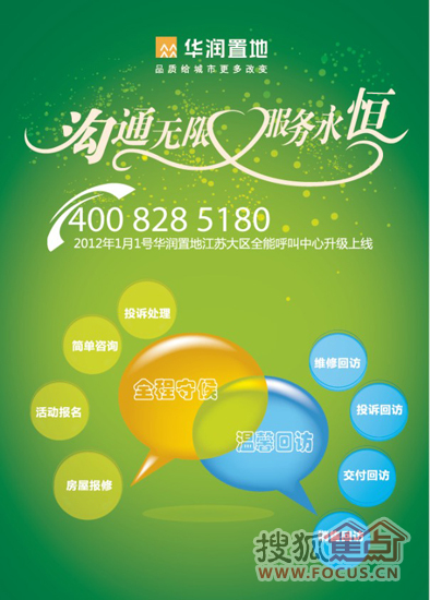 2012年1月1日,伴随着新年钟声,华润置地在江苏片区内的客户服务热线400-828-5180正式升级上线,这不仅是苏州 (论坛)人居环境不断改善的一大利好,也是开发商华润置地尊重人居环境发展、重视客户感受,践行“品质给城市更多改变”的品牌理念的一大举措。