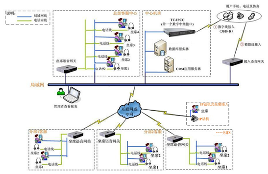 由于瑞臣涉及到的是遍及全国的营养屋,因此采用的方式是分布式坐席方案,因此全胜呼叫中心解决方案采用IPCC解决方案,IPCC方案适合广大用户使用,性价比高、稳定性好、升级扩容方便且不会造成升级前的设备浪费、兼容性好(满足与所有业务系统、数据库等接口,并融为一体!拓扑图如下: