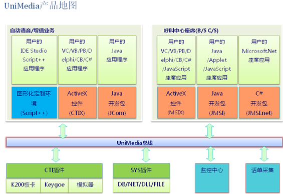 UniMedia中间件是新一代融合媒体业务级中间件,帮助系统集成商快速实现各种语音增值服务平台和各类呼叫中心系统。精细化的分工与协作是UniMedia的一贯定位, UniMedia专注于呼叫中心语音技术,我们的合作伙伴专注于业务领域,让我们的合作伙伴成为国内最专业的呼叫中心集成商。