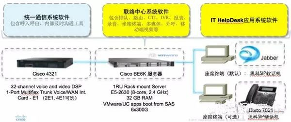 对于已经使用思科的统一通讯平台的企业来说,构建IT Helpdesk将更加简便易行。只需在原有的统一通讯平台上增加相应的联络中心系统软件和IT HelpDesk CRM应用软件即可,无需为IT Helpdesk独立构建系统平台。大大降低了企业的建设成本和复杂程度,快速实现企业IT Helpdesk 应用。