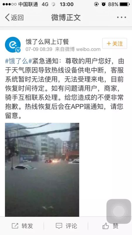 之后,饿了么官方微博发布了机房断电的通知,