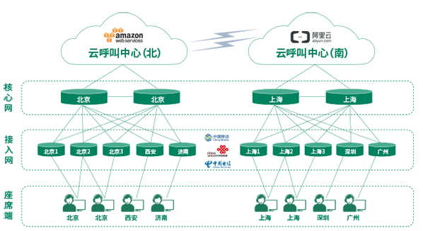 三层组网保证网络高可用性。这种组网方式不仅可用性高,也可以方便全国各地座席端快速接入。