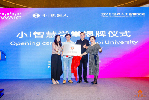 值得注意的是,在该主题论坛上,还有一个特殊的环节——小i智慧学堂揭牌仪式。中国人工智能学会智能服务专委会张军平、华东师范大学计算机科学技术系贺樑主任、Y-CITY 全球创新学院总监金冰冰、小i机器人高级副总裁许弋亚等为小i智慧学堂揭牌。