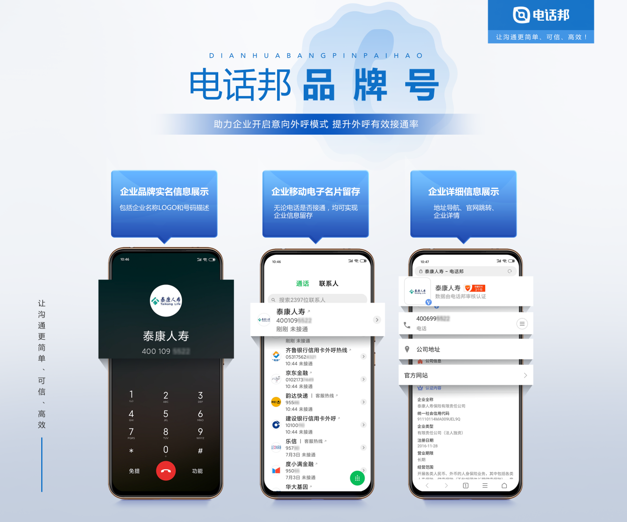 何为实名意向外呼?即在用户接听前先递出企业的“电子名片”,用真实信息取代陌生号码在用户终端进行展示,不但可以提高号码辨识度,还可以提升有效接通率,降低企业运营成本,提升工作效率,这就是电话邦的品牌号服务。