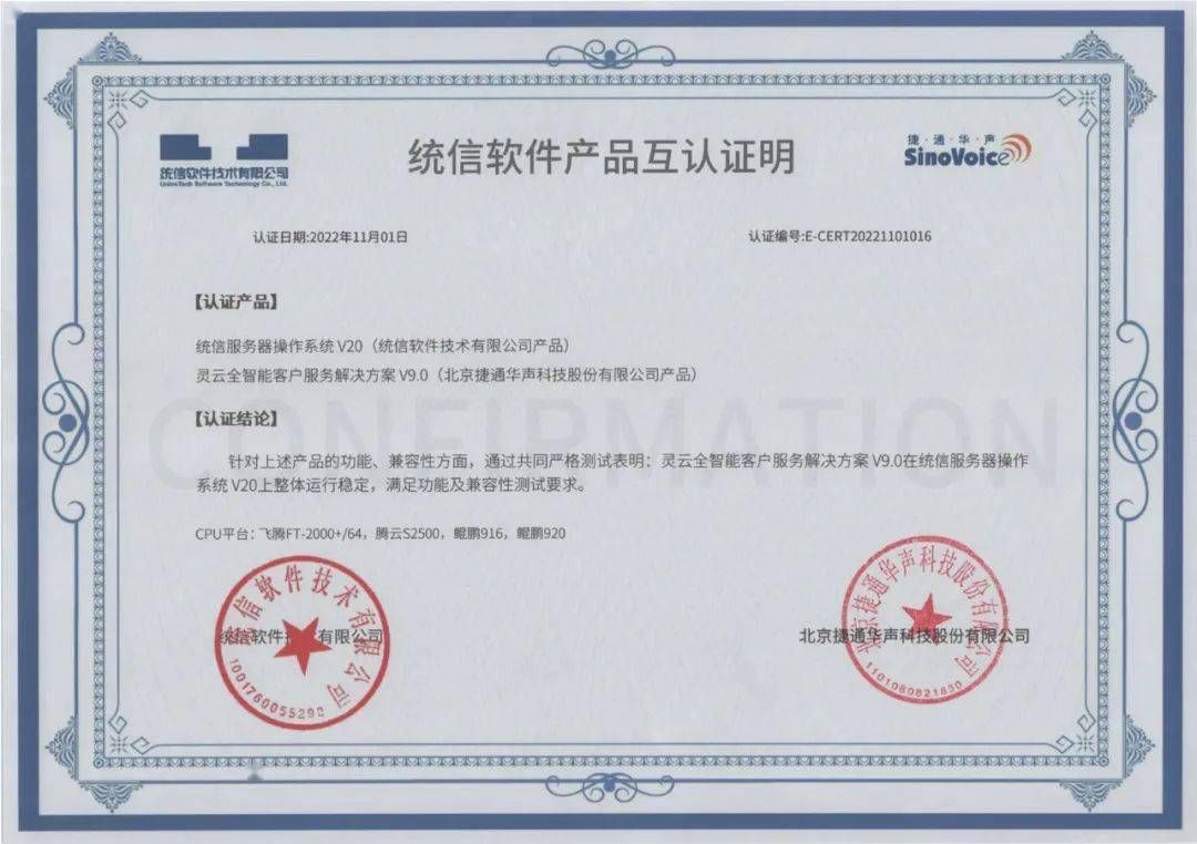 近日,捷通华声推出的灵云AICC全智能客户服务解决方案完成与统信服务器操作系统V20兼容性互认证,并基于软硬件底座进行全栈优化,进一步提升了产品性能与可靠性、安全性。