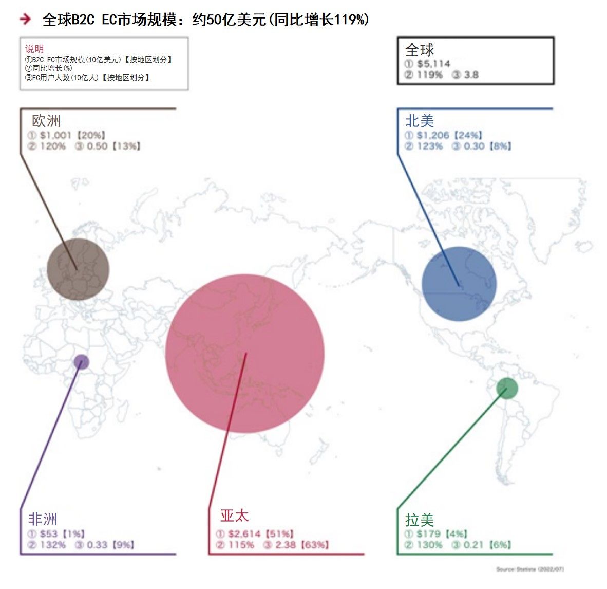 自2020年,由于新型冠状病毒在全世界的蔓延,受其影响B2C电商市场的发展一度放缓;2021年,B2C电商市场重回增长轨道,同比增长119%,达51,140亿美元,创历史新高。预计今后将以12.7%的年均增长率保持稳步增长,到2031年将达到16.9万亿美元。随着出境与出行限制的放宽,各国经济正在逐渐恢复至疫情前的水平。一方面消费者呈现重新回归实体店消费的趋势,另一方面电商用户的数量对比去年增长了110%,达到约38亿人。以电商新兴国家为主的电商用户规模正在迅速增长,同时线上购物也正在这些国家中兴起和普及。