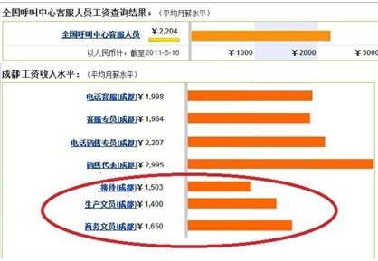 伴随它的迅猛发展,带来对呼叫中心从业人员的大批量需求。据不完全统计显示:目前成都的呼叫中心从业人员有10多万人,并且每年还以30%以上的速度在增长。换句话说:成都呼叫中心行业每年至少有3万多人的招聘需求。随着对呼叫中心的重视,企业不断加大建设扩张,坐席人员的工作环境、薪酬福利也水涨船高。统计显示,呼叫中心员工的平均学历70%在大专以上,收入比其他行业平均高50%以上。这是某网站最新的薪酬调查报告。从上述数据不难看出,在大中专毕业生常见的求职岗位中,呼叫中心坐席人员的薪酬普遍略高。一方面是呼叫中心优厚薪资福利待遇招不到需要的人才,另一方面大批毕业生找不到工作。这显而易见的失衡状态源何而来?