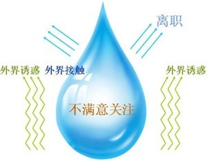 我将通过水蒸发原理来从另一个角度阐释员工维系(离职对抗)(图2)。如上所述,呼叫中心就如同一个水体,座席员工就如同水分子,员工离职(水蒸发)受3个因素影响:1、员工不满意的关注(温度),2、员工与外界的接触面(水的表面积),3、外界诱惑(空气流动速度)。