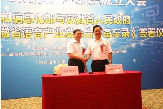 2012年8月1日上午,中国语音产业联盟成立大会暨工业和信息化部与安徽省人民政府《全面加快语音产业发展合作备忘录》签署仪式在北京万寿宾馆成功举行。