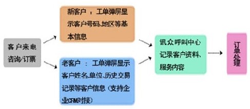 如上图所示,讯众通信托管型呼叫中心就能将“专属服务”通过电话“传递”给客户。呼叫中心的“客户资料来电弹屏”功能,将判断客户否为会员,该客户的姓名、性别、电话、所在地、过往交易记录等资料将以工单形式弹屏,便于业务员查看;还可以根据客户喜好为其准备定期票务推荐。客户则能够感受到企业对老客户的关怀和用心,忠诚度将更加持续。