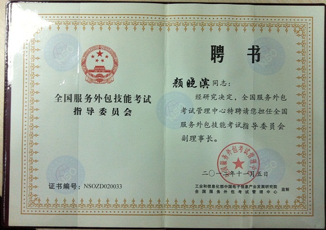 2012年11月9日北京:日前,4PS联络中心国际标准/CNCBA主席颜晓滨同志受聘被任命为工业和信息化部全国服务外包技能考试指导委员会副理事长,参与策划组织该委员会的各项活动,并在活动组织机构中任重要职务。作为全国服务外包技能考试指导委员会的核心领导成员,直接参与该委员会的重大事项的表决和制定长期工作规划。