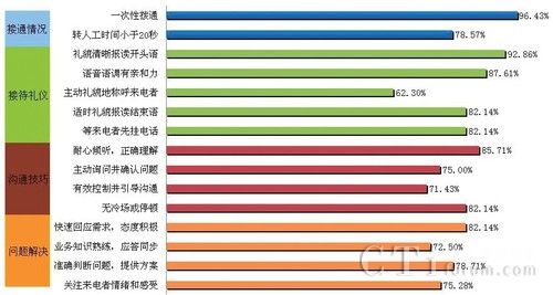 就热线服务四个环节(接通情况、接待礼仪、沟通技巧和问题解决)的监测结果看,接通情况表现较为良好,“一次性拨通”指标平均实现率为96.43%,情况较为乐观。但在“转人工时间<20秒”的指标上,不是太理想,平均实现率仅为78.57%。