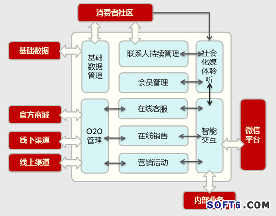 企业要开发微信CRM,首先要从业务架构上进行设计清楚。微信CRM的本质,是在微信渠道上利用微信的特点和接口而扩展的CRM系统。而CRM系统,一般可以分为五大模块:客户、销售、营销、服务、会员,另外还有一些附属模块:产品、知识库、活动、交易、统计报表等。在确定微信CRM的业务架构后就可以进一步设计具体的数据模型、功能模块和接口对接了。