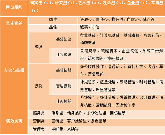 (3)知识与技能。根据客户服务中心业务运营范畴,知识素质可以分类为基础知识与专业知识,技能素养可分为专业技能、管理技能、沟通写作能力、逻辑思维能力等。知识素质可以通过业务测试的方式获取相关数据,专业技能评测可以通过客户服务中心内部评测部门如质量检测部门来评测,也可以通过模拟测试的方式来测试计算机操作能力等,管理技能、沟通写作能力可以通过民主测评的方式开展,逻辑思维能力可以通过专用的逻辑思维能力试卷进行测量评定。